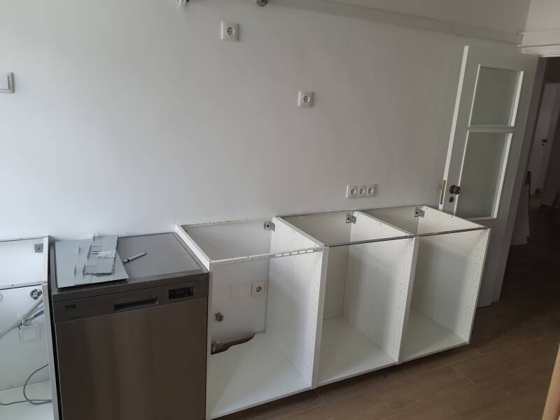 Escolhi uma cozinha de gama alta qualidade da marca Ikea. Ela até foi cuidadosamente instalada por mim. A única dificuldade era que ela não poderia ser muito alta por causa da viga no meio. Foi decidido ficar abaixo porque a Ikea não faz personalizações como o nosso carpinteiro faria.
